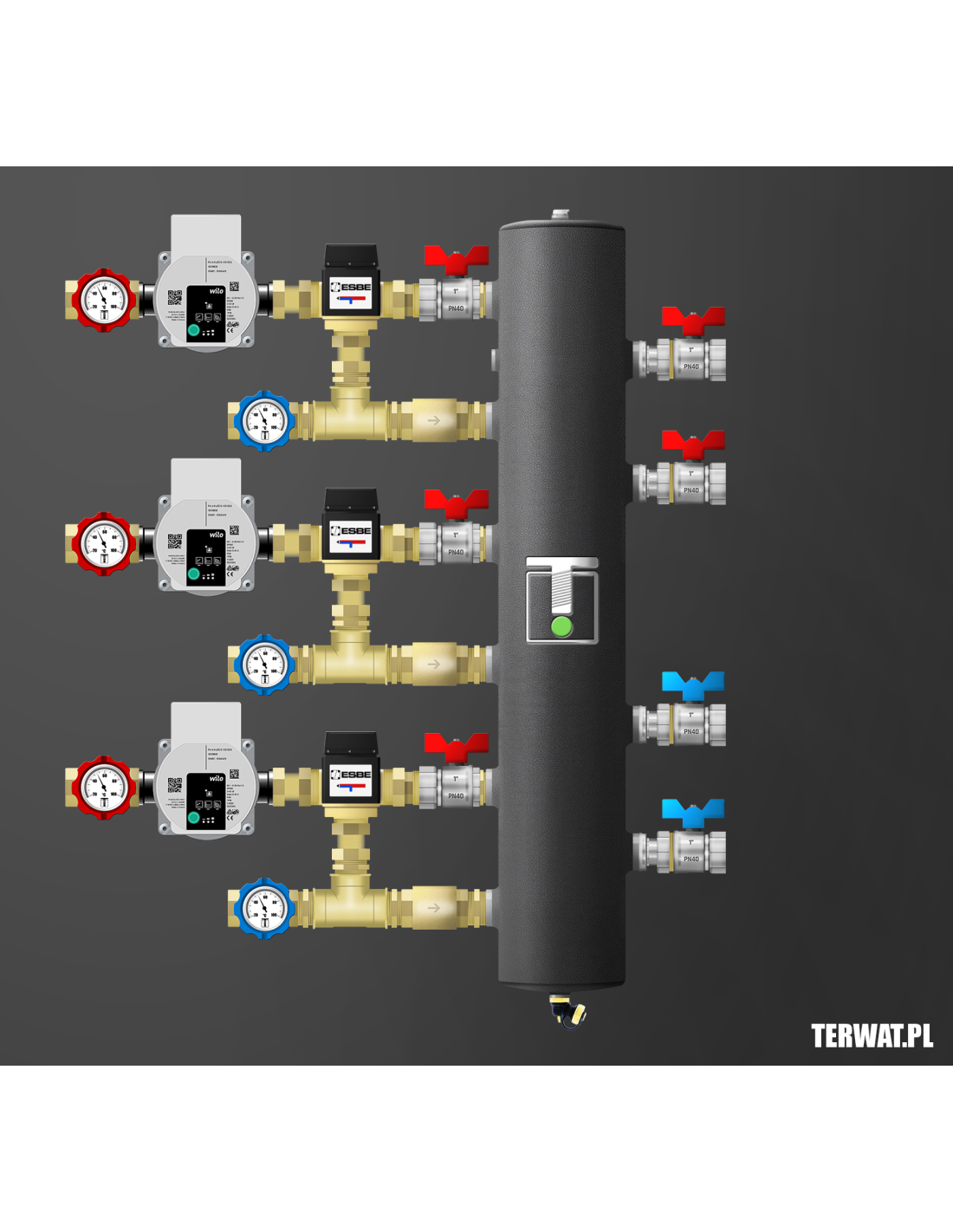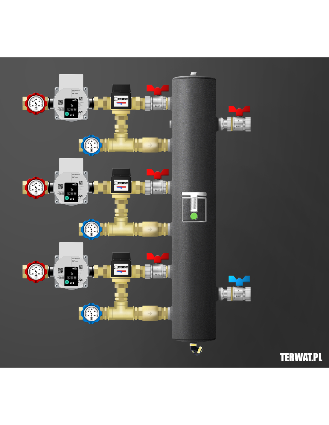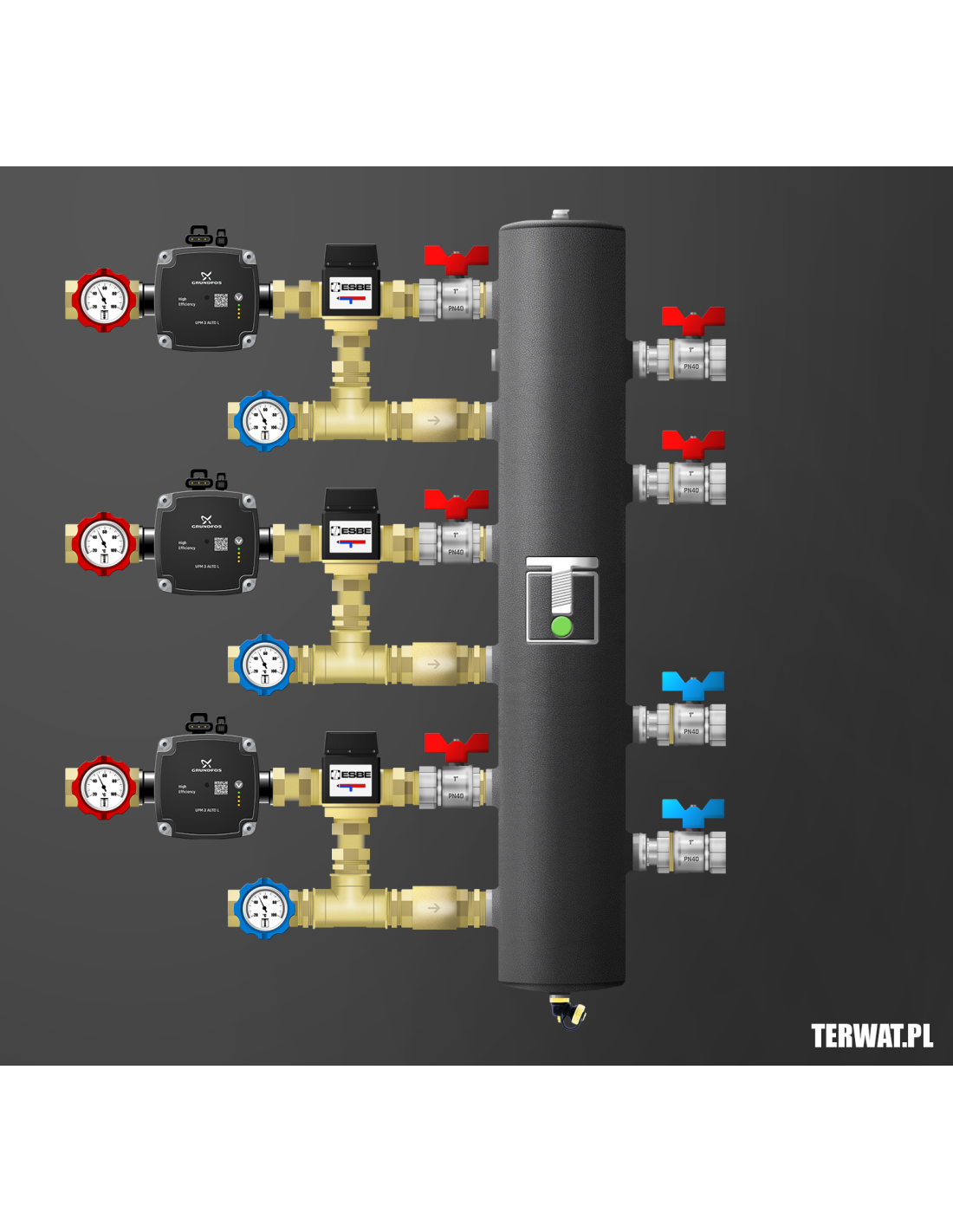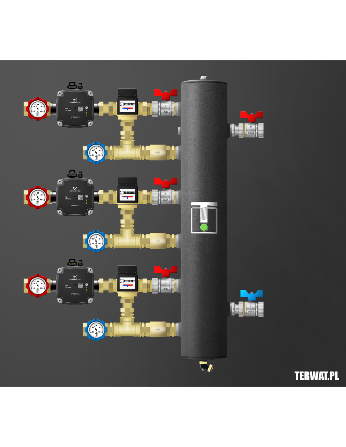 Kompletny zestaw sprzęgła hydraulicznego z trzema obiegami – wszystkie z zaworem mieszającym termostatycznym ESBE 20-55°C Kvs 3.4. Ilość źródeł ciepła do wyboru. W komplecie zawory odcinające 1”, pompy Grundfos UPM 3 AUTO L 15-70 (lub WILO Para), termometry bimetaliczne, odpowietrznik, zawór spustowy, zawory zwrotne na powrocie. Kompletny zestaw do montażu w kotłowni. Montaż w pionie i poziomie. Wersja prawa na zamówienie. Na życzenie zamontujemy kompletną grupę ochrony powrotu kotła stałopalnego z regulowanym zaworem temperaturowym ESBE w zakresie 50-70 st lub grupę ładowania sprzęgła.