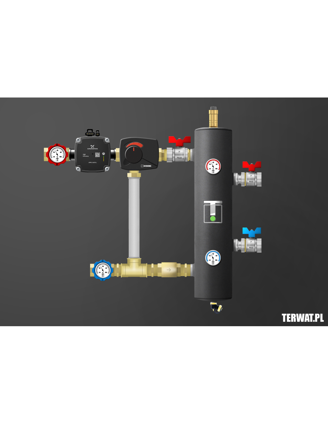 Kompletny zestaw sprzęgła hydraulicznego z jednym obiegiem bezpośrednim. Jedno źródło ciepła. W komplecie zawory odcinające 1” z półśrubunkami po stronie kotła, zawory 1" z termometrami po stronie instalacji, pompy Grundfos UPM 3 AUTO L 15-70 (lub WILO Para), termometry bimetaliczne, odpowietrznik automatyczny Flamco, zawór spustowy, zawory zwrotne na powrotach, izolacja sprzęgła. Kompletny zestaw do montażu w kotłowni. Montaż w pionie i poziomie. Wersja prawa na zamówienie. Opcjonalnie istnieje możliwość zainstalowania przy układzie grupy ochrony powrotu lub grupy ładowania sprzęgła - polecane do kotłów stałopalnych, dla ochrony powrotu i ładowania sprzęgła.