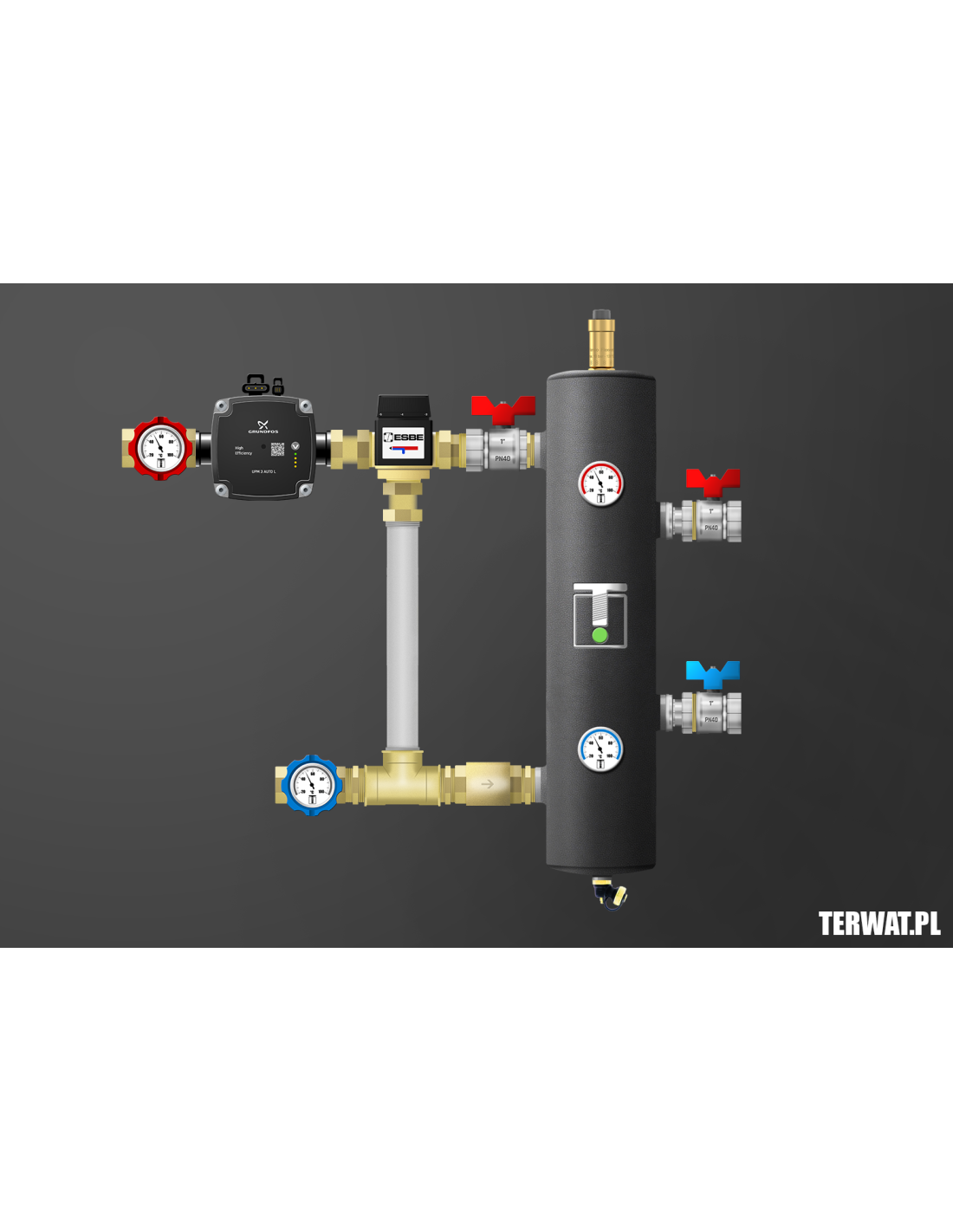 Kompletny zestaw sprzęgła hydraulicznego z jednym obiegiem - podmieszanie na zaworze termostatycznym ESBE 20-55 stopni, KVS 3,4 m3/h. Jedno źródło ciepła. W komplecie zawory odcinające 1” z półśrubunkami po stronie kotła, zawory 1" z termometrami po stronie instalacji, pompy Grundfos UPM 3 AUTO L 15-70 (lub WILO Para), termometry bimetaliczne, odpowietrznik automatyczny Flamco, zawór spustowy, zawory zwrotne na powrotach, izolacja sprzęgła. Kompletny zestaw do montażu w kotłowni. Montaż w pionie i poziomie. Wersja prawa na zamówienie. Opcjonalnie istnieje możliwość zainstalowania przy układzie grupy ochrony powrotu lub grupy ładowania sprzęgła - polecane do kotłów stałopalnych, dla ochrony powrotu i ładowania sprzęgła.