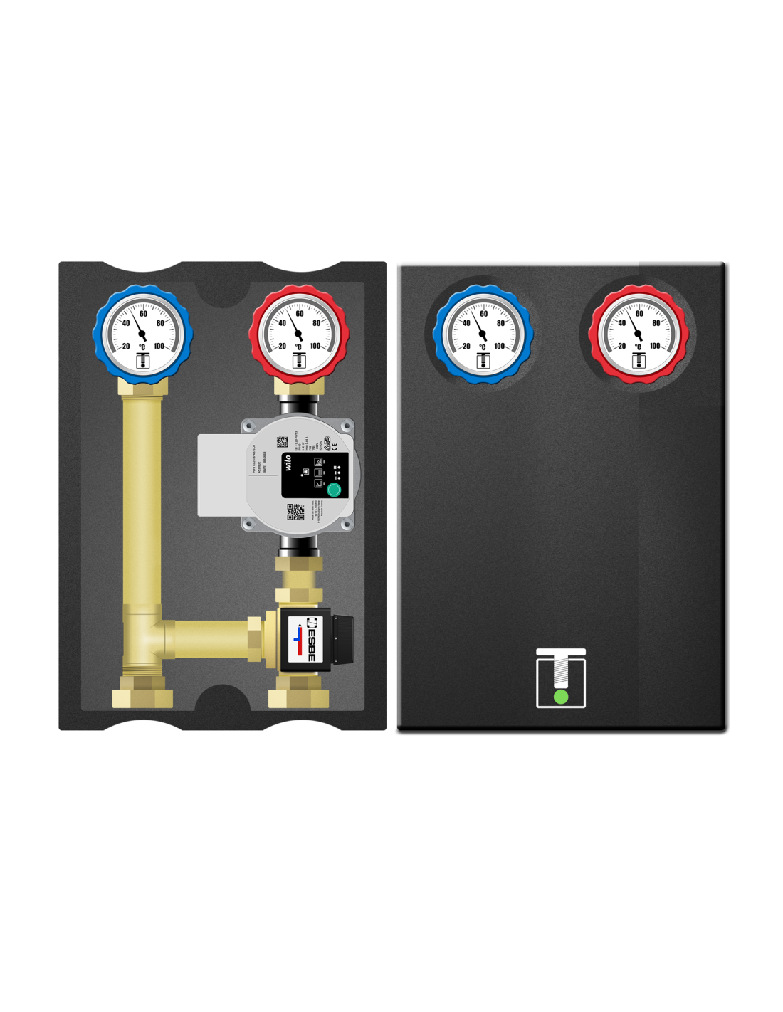 Grupa izolowana z zaworem termostatycznym. Zawiera w swojej konstrukcji zawór termostatyczny ESBE 20-55°C Kvs 3,4, zawór zwrotny, zawory odcinające z termometrami, wyposażone także w osłony do czujników temperatury.