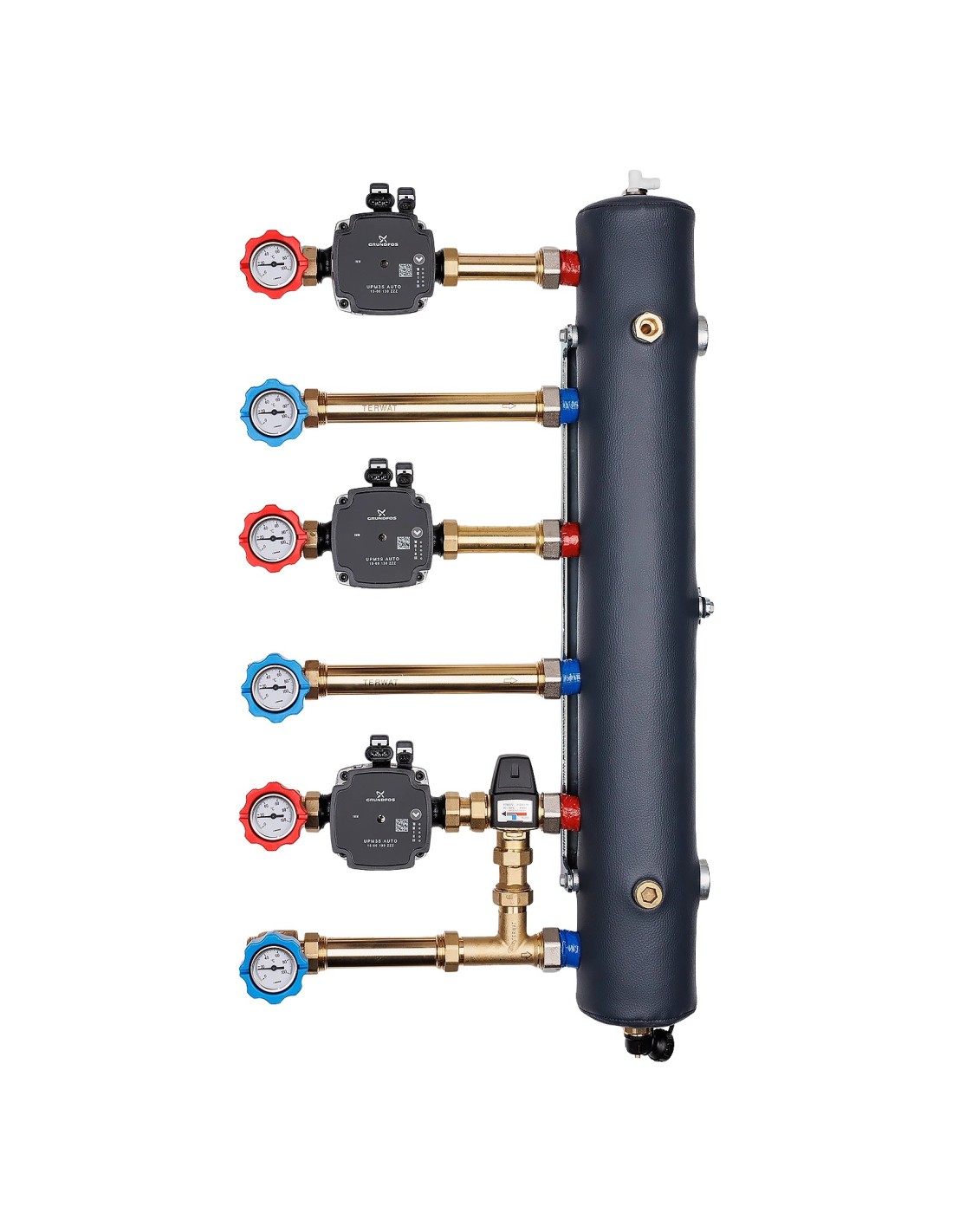 Zestaw ze sprzęgłem w izolacji i grupami pompowymi. Wariant posiada 2 obiegi bezpośrednie i 1 obieg z podmieszaniem – zawór termostatyczny 20-50°C (Kvs 3,4) ESBE. Na wyposażeniu po stronie instalacji zawory kulowe 1” z termometrami. Grupa ochrony powrotu jest wyposażeniem dodatkowym – jeśli nie zostanie zamówiona, po stronie źródła ciepła będą tylko króćce przyłączeniowe 1” GW.