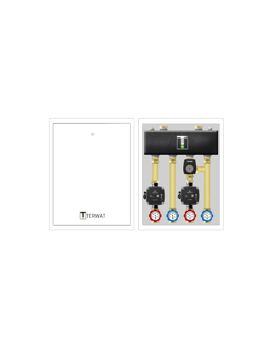 Układ hydrauliczny w szafce stalowej malowanej proszkowo na kolor biały. Dla ułatwienia szafka daje możliwość zdjęcia obudowy i montażu na ścianie tylko panelu z układem hydraulicznym (odpinane plecy). Wariant posiada 1 obieg bezpośredni oraz 1 obieg z podmieszaniem - zawór obrotowy mieszający.