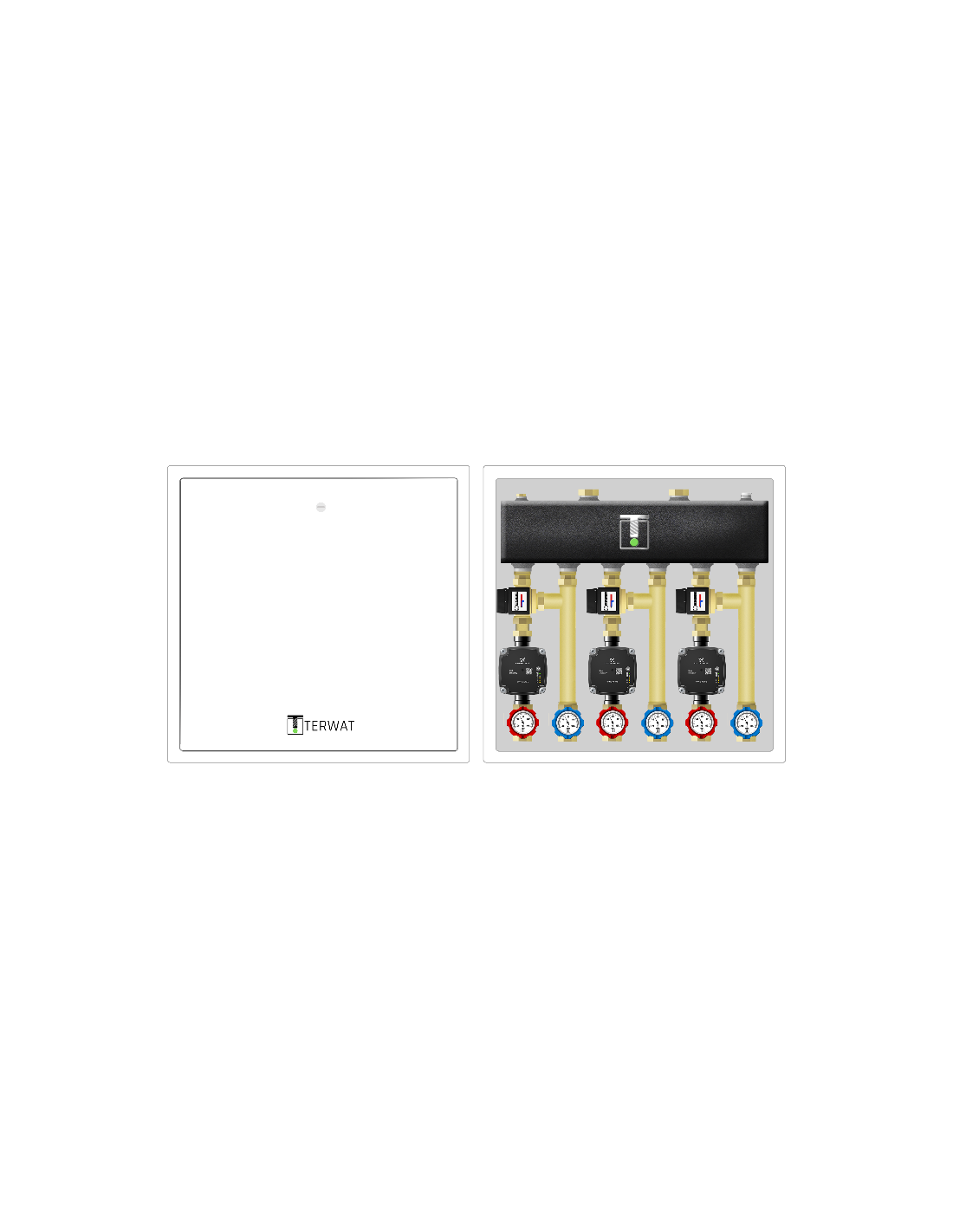 Układ hydrauliczny w szafce stalowej malowanej proszkowo na kolor biały. Dla ułatwienia szafka daje możliwość zdjęcia obudowy i montażu na ścianie tylko panelu z układem hydraulicznym (odpinane plecy). Wariant posiada 3 obiegi z podmieszaniem - zawory termostatyczne 20-50°C (Kvs 3,4) ESBE.