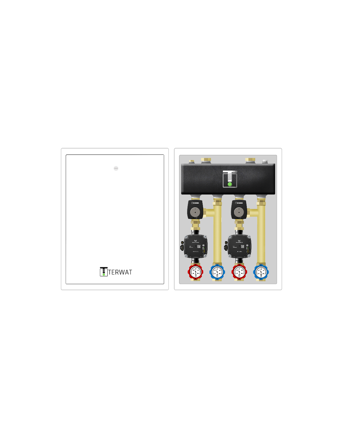 Układ hydrauliczny w szafce stalowej malowanej proszkowo na kolor biały. Dla ułatwienia szafka daje możliwość zdjęcia obudowy i montażu na ścianie tylko panelu z układem hydraulicznym (odpinane plecy). Wariant posiada 2 obiegi z podmieszaniem - zawór obrotowy 3-drogowy .