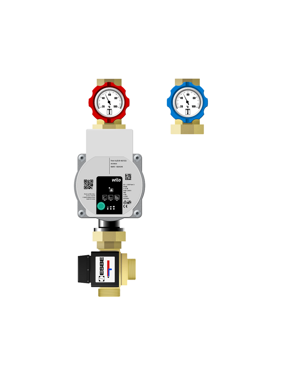 Grupa pompowa odpowiedzialna jest za wytworzenie temperatury o zadanej temperaturze - w tej wersji z zaworem termostatycznym 20-55°C (Kvs 3,4) i cyrkulację czynnika do obiegów grzewczych. W tym wypadku wersja bez izolacji, do montażu w kotłowni. Przyłącza 1". Całość napędzana pompą elektroniczną - do wyboru. W zaworze powrotnym zawór zwrotny.