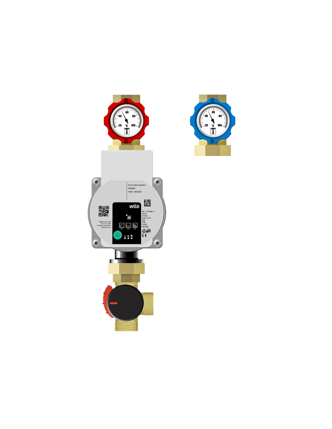 Grupa pompowa odpowiedzialna jest za wytworzenie temperatury o zadanej temperaturze - w tej wersji z zaworem obrotowym z siłownikiem elektrycznym ESBE (Kvs 10) i cyrkulację czynnika do obiegów grzewczych. W tym wypadku wersja bez izolacji, do montażu w kotłowni. Przyłącza 1". Całość napędzana pompą elektroniczną - do wyboru. W zaworze powrotnym zawór zwrotny.