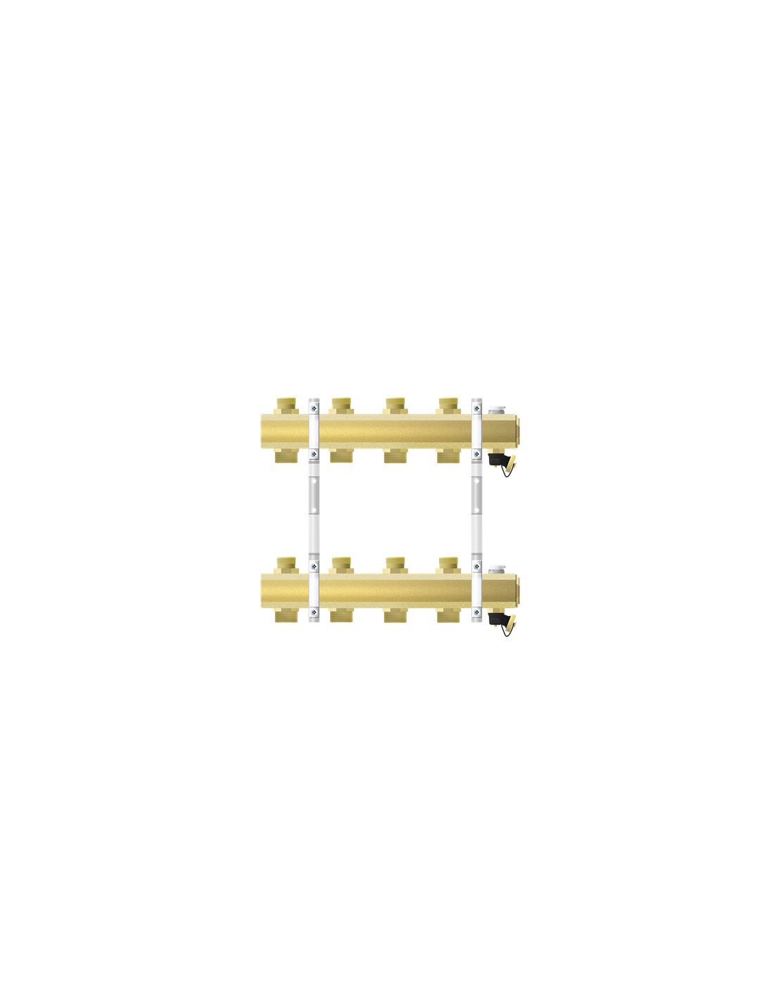 Rozdzielacz oparty na belce mosiężnej 1". W komplecie zawory odcinające na imbus, odpowietrzniki ręczne, zawory spustowe grzybkowe, uchwyty, korki z uszczelnieniem na końcu belek. Rozstaw pomiędzy sekcjami - 50 mm, rozstaw belek - 210 mm lub 235 mm. Szerokość rozdzielacza 250 mm.