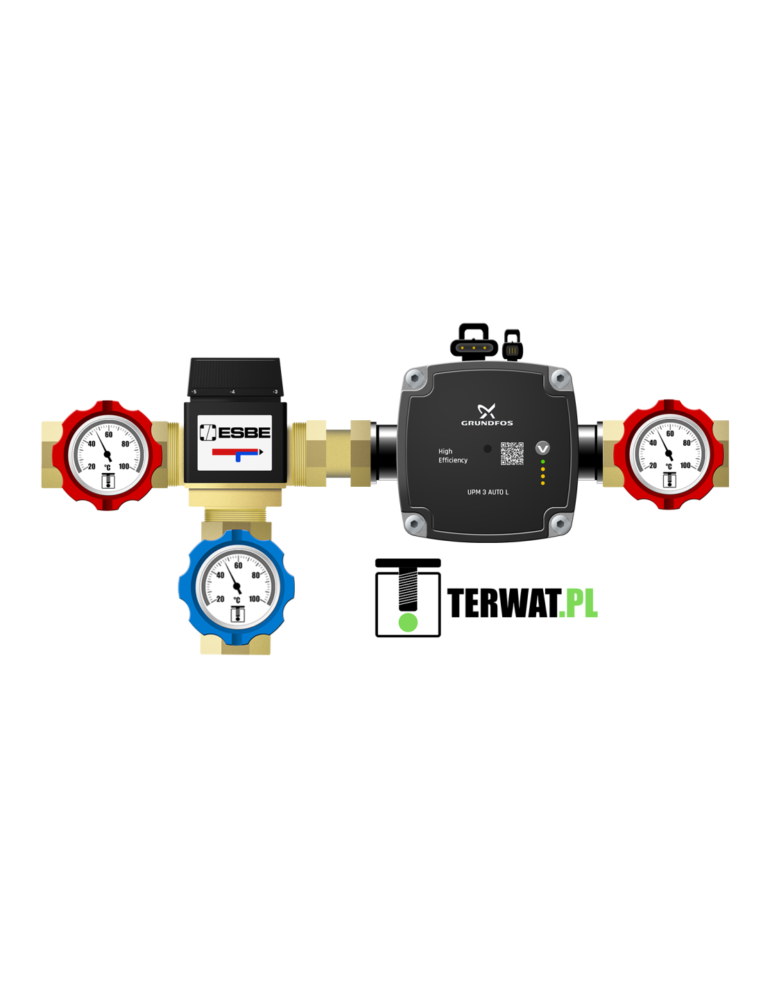 Grupa pompowa odpowiedzialna jest za wytworzenie temperatury o zadanej temperaturze – w tej wersji z zaworem termostatycznym ESBE 20-55°C (Kvs 3,4) i cyrkulację czynnika do obiegów grzewczych. W tym wypadku wersja bez izolacji, do montażu w kotłowni. Na wejściach i wyjściu zawory kulowe 1” z termometrami. Całość napędzana pompą Grundfos UPM 3 AUTO L 15-70 lub Wilo Para 15/6.