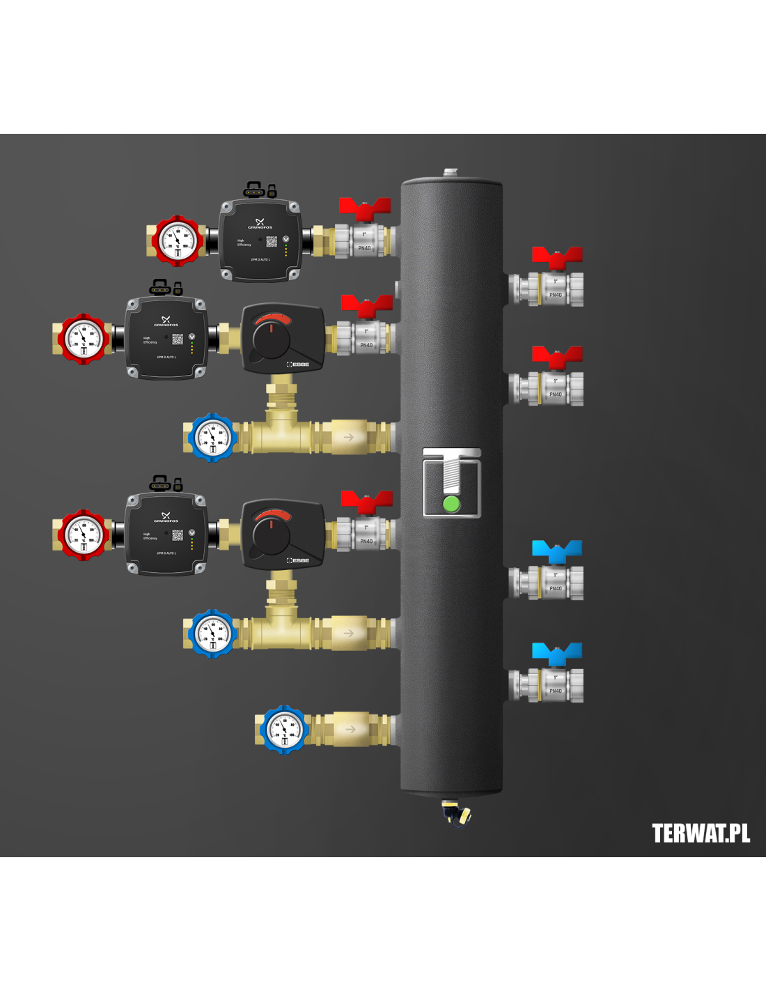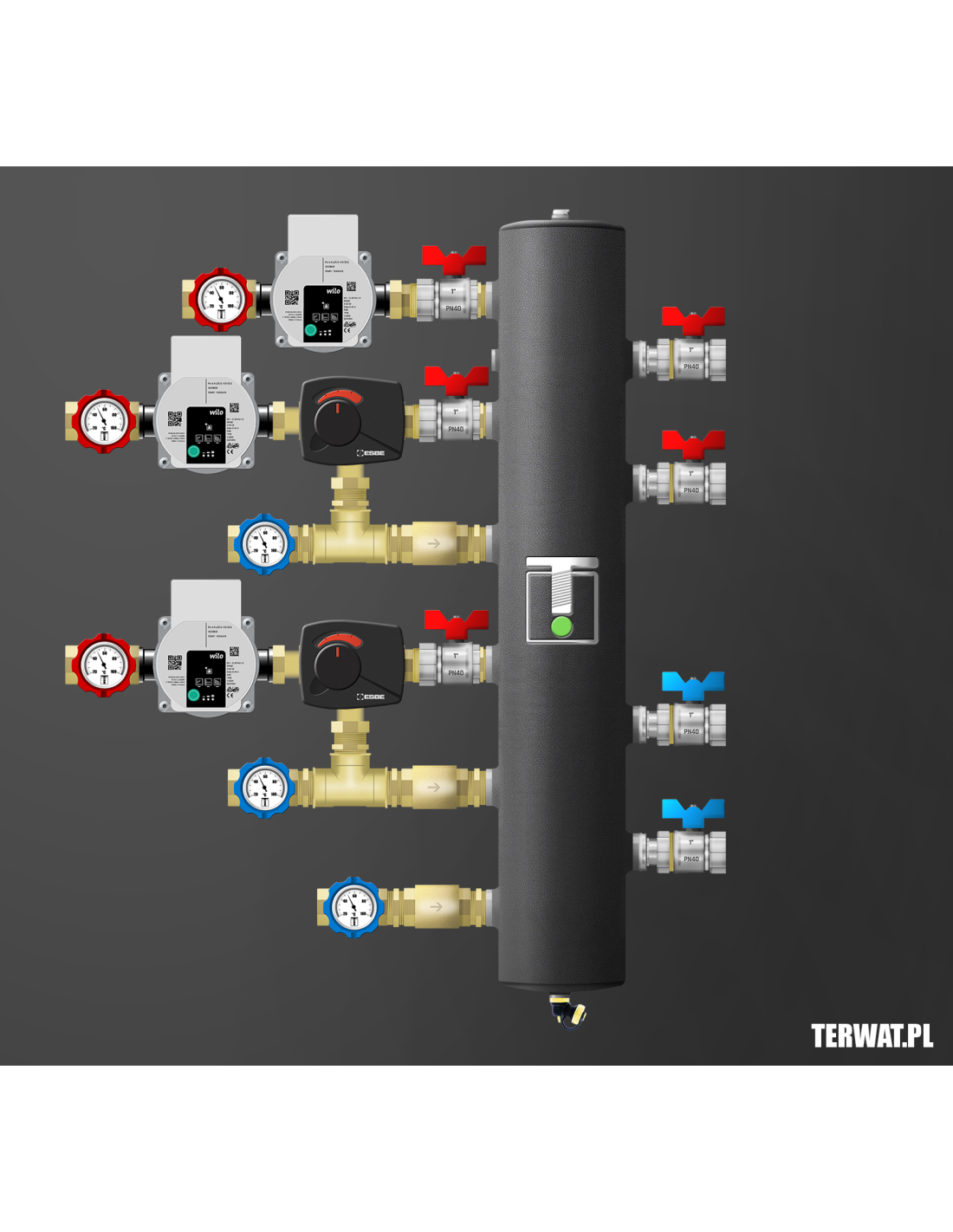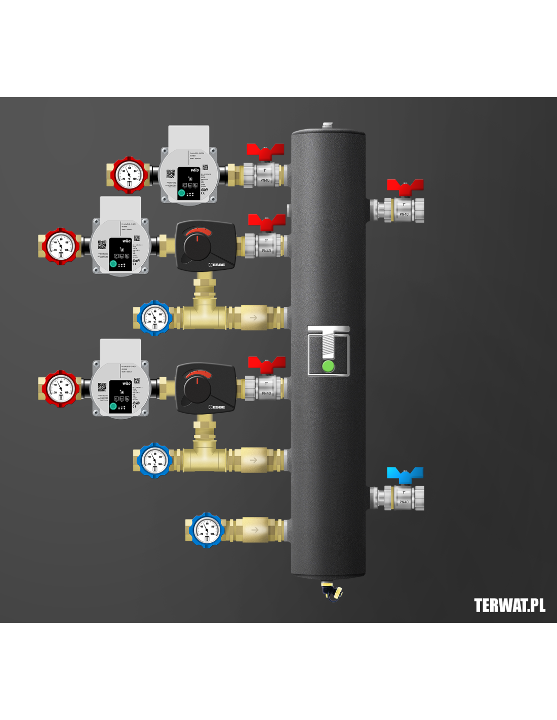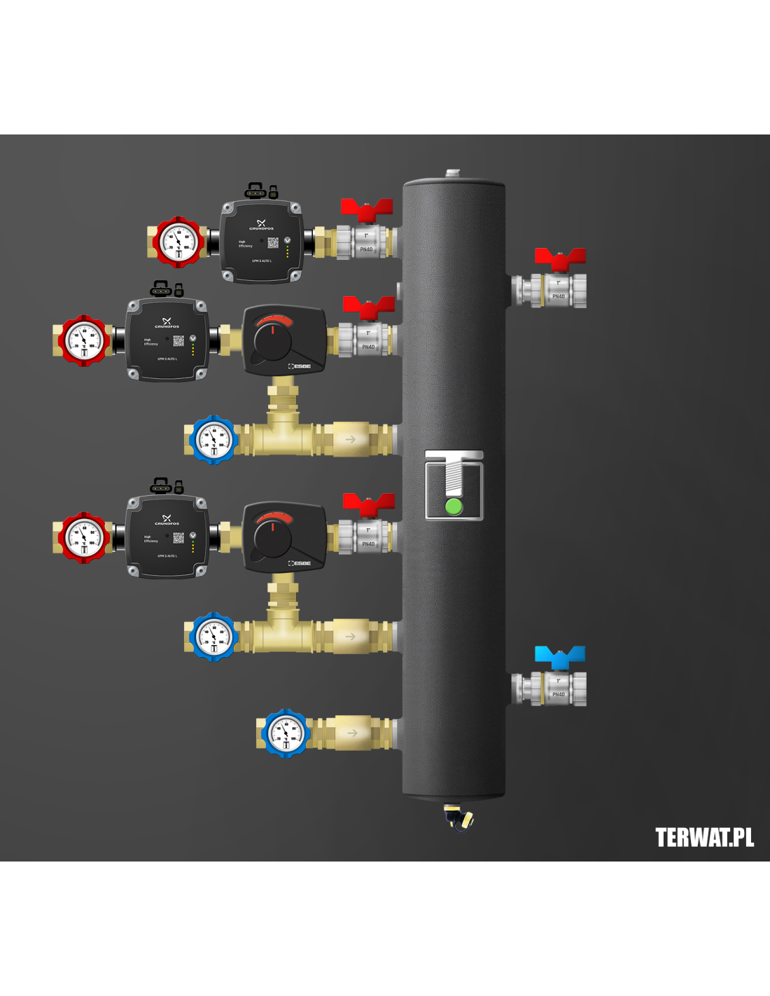 Kompletny zestaw sprzęgła hydraulicznego z trzema obiegami – jeden bezpośredni, dwa z zaworem obrotowym z siłownikiem ESBE ARA 661. Ilość źródeł ciepła do wyboru. W komplecie zawory odcinające 1”, pompy Grundfos UPM 3 AUTO L 15-70 (lub WILO Para), termometry bimetaliczne, odpowietrznik, zawór spustowy, zawory zwrotne na powrocie. Kompletny zestaw do montażu w kotłowni. Montaż w pionie i poziomie. Wersja prawa na zamówienie. Na życzenie zamontujemy kompletną grupę ochrony powrotu kotła stałopalnego z regulowanym zaworem temperaturowym ESBE w zakresie 50-70 st lub grupę ładowania sprzęgła.