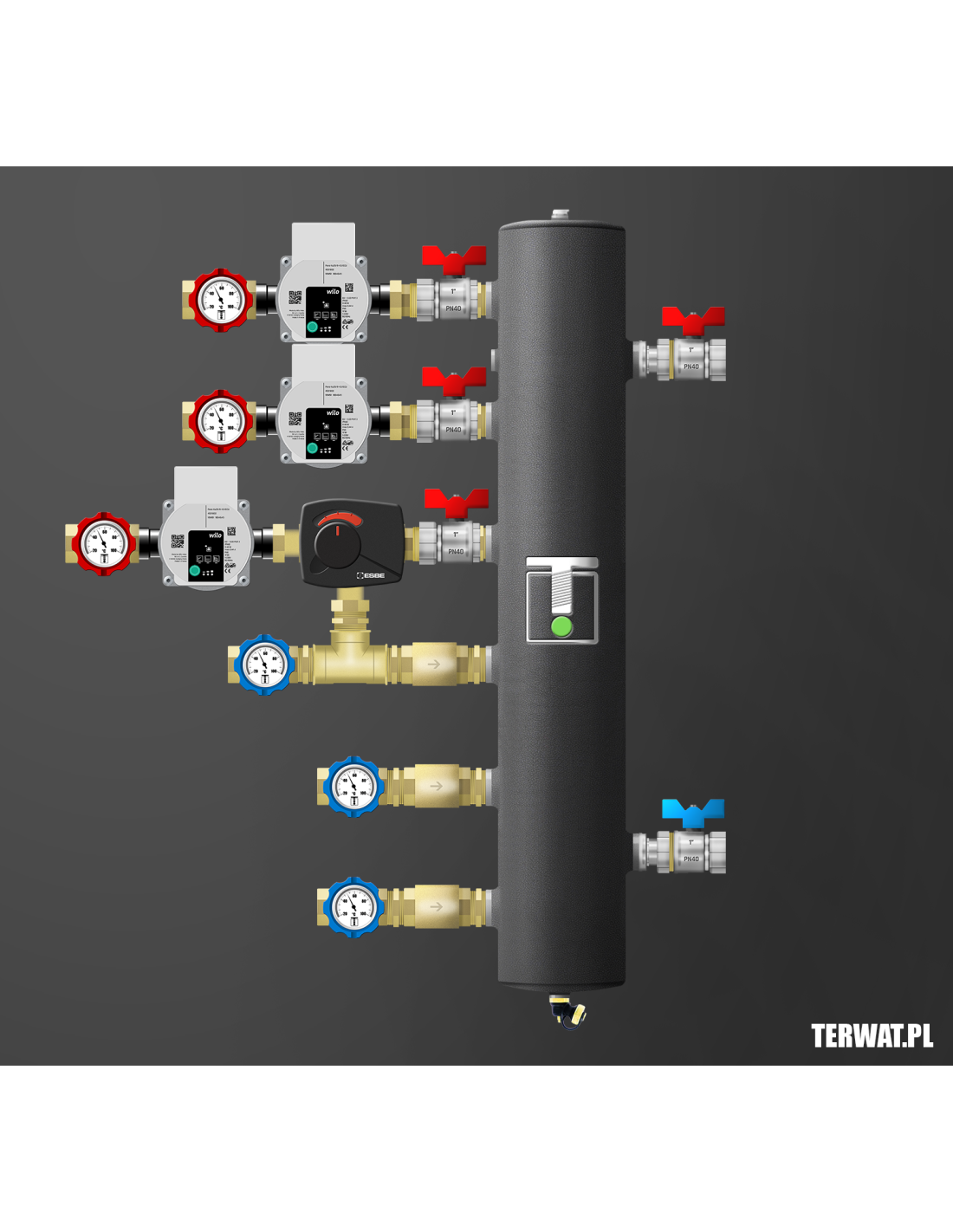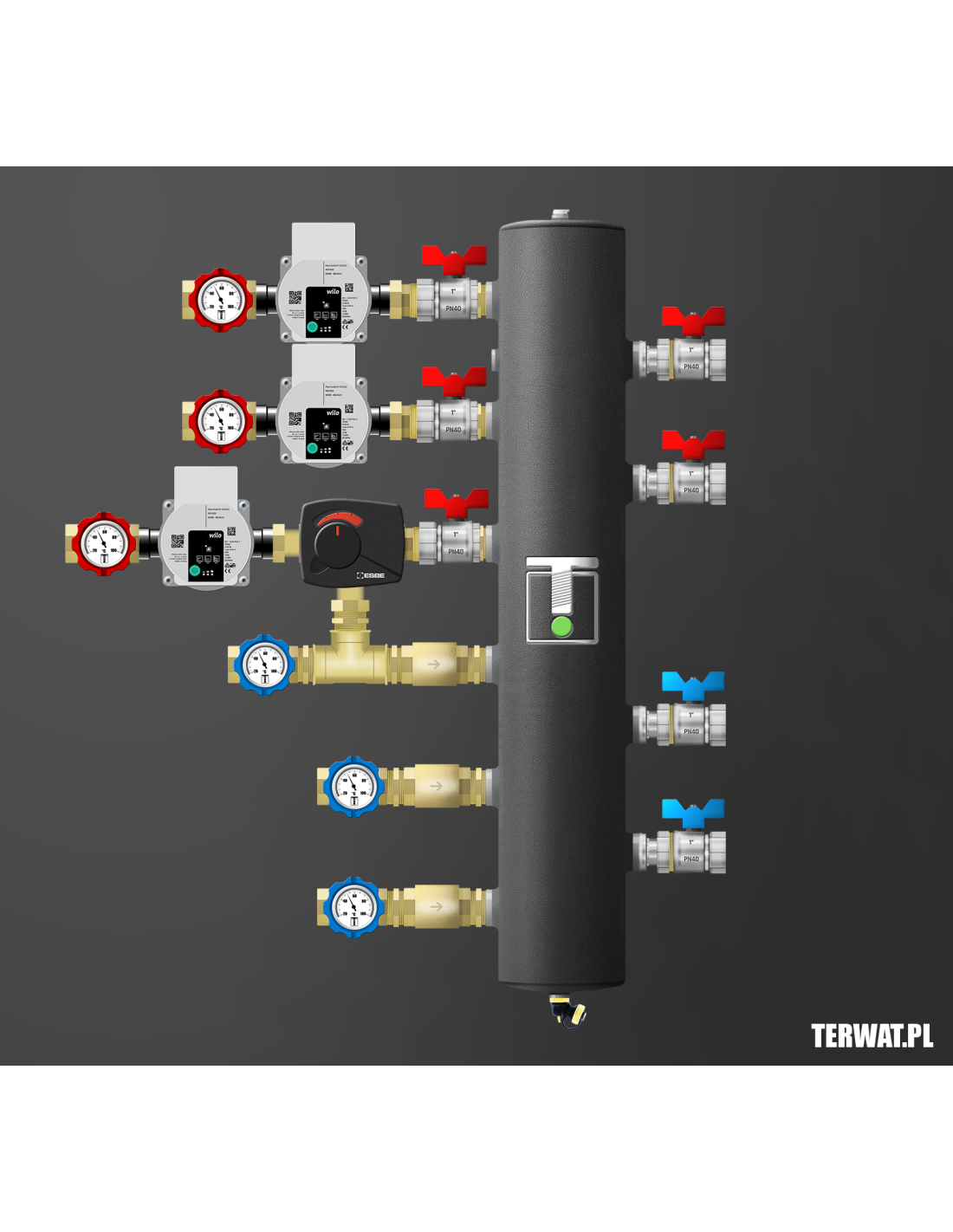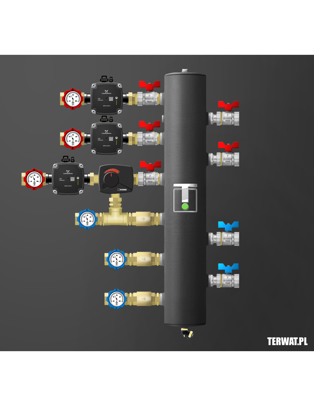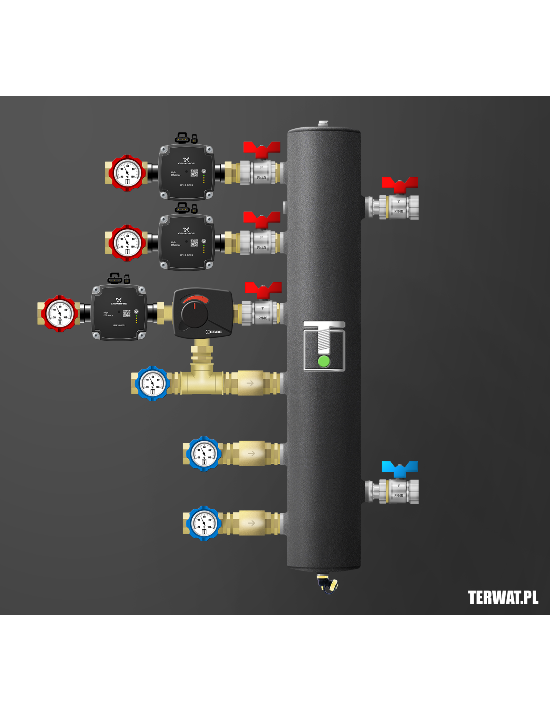 Kompletny zestaw sprzęgła hydraulicznego z trzema obiegami – dwa bezpośrednie, jeden z zaworem obrotowym z siłownikiem ESBE ARA 661. Ilość źródeł ciepła do wyboru. W komplecie zawory odcinające 1”, pompy Grundfos UPM 3 AUTO L 15-70 (lub WILO Para), termometry bimetaliczne, odpowietrznik, zawór spustowy, zawory zwrotne na powrocie. Kompletny zestaw do montażu w kotłowni. Montaż w pionie i poziomie. Wersja prawa na zamówienie. Na życzenie zamontujemy kompletną grupę ochrony powrotu kotła stałopalnego z regulowanym zaworem temperaturowym ESBE w zakresie 50-70 st lub grupę ładowania sprzęgła.
