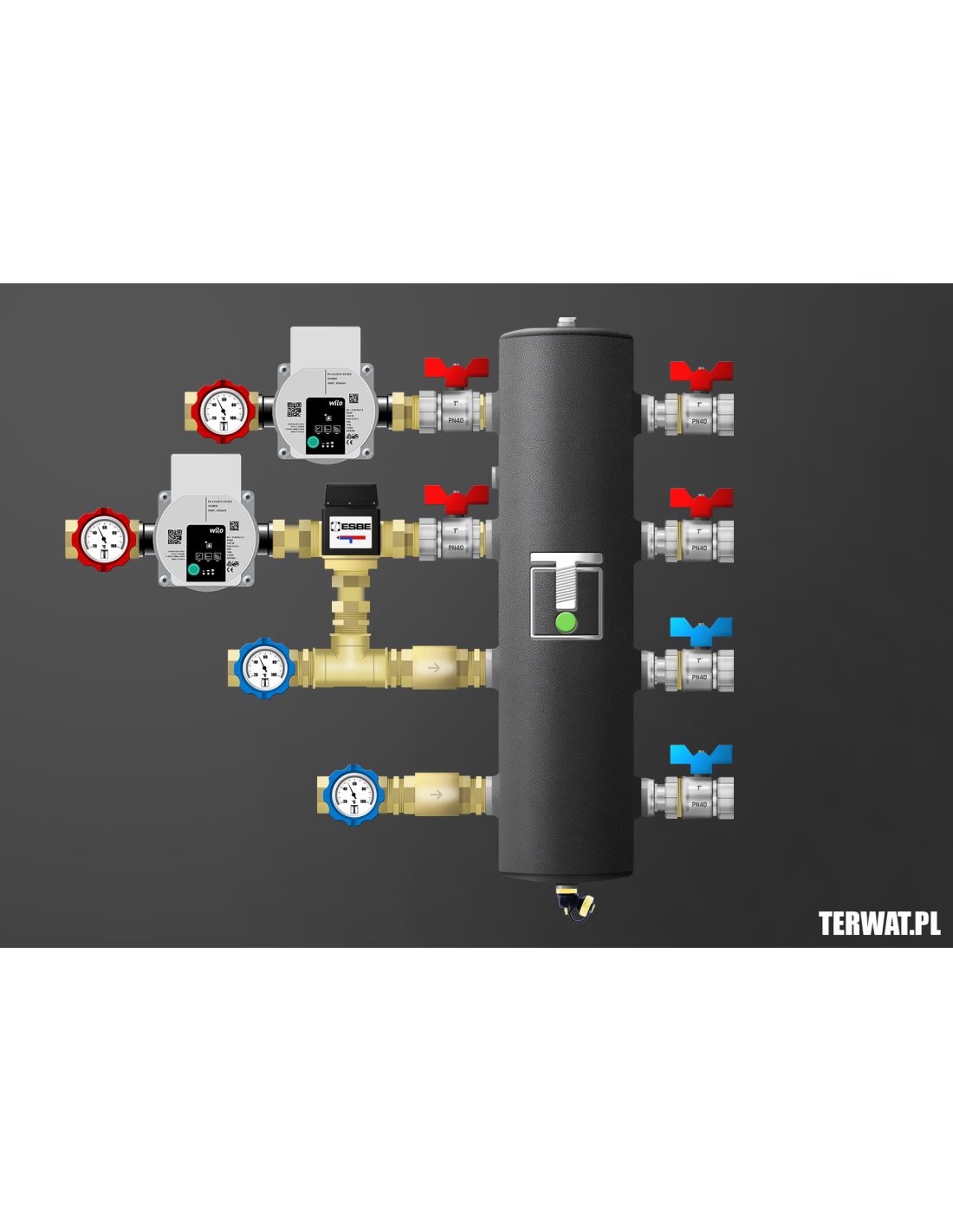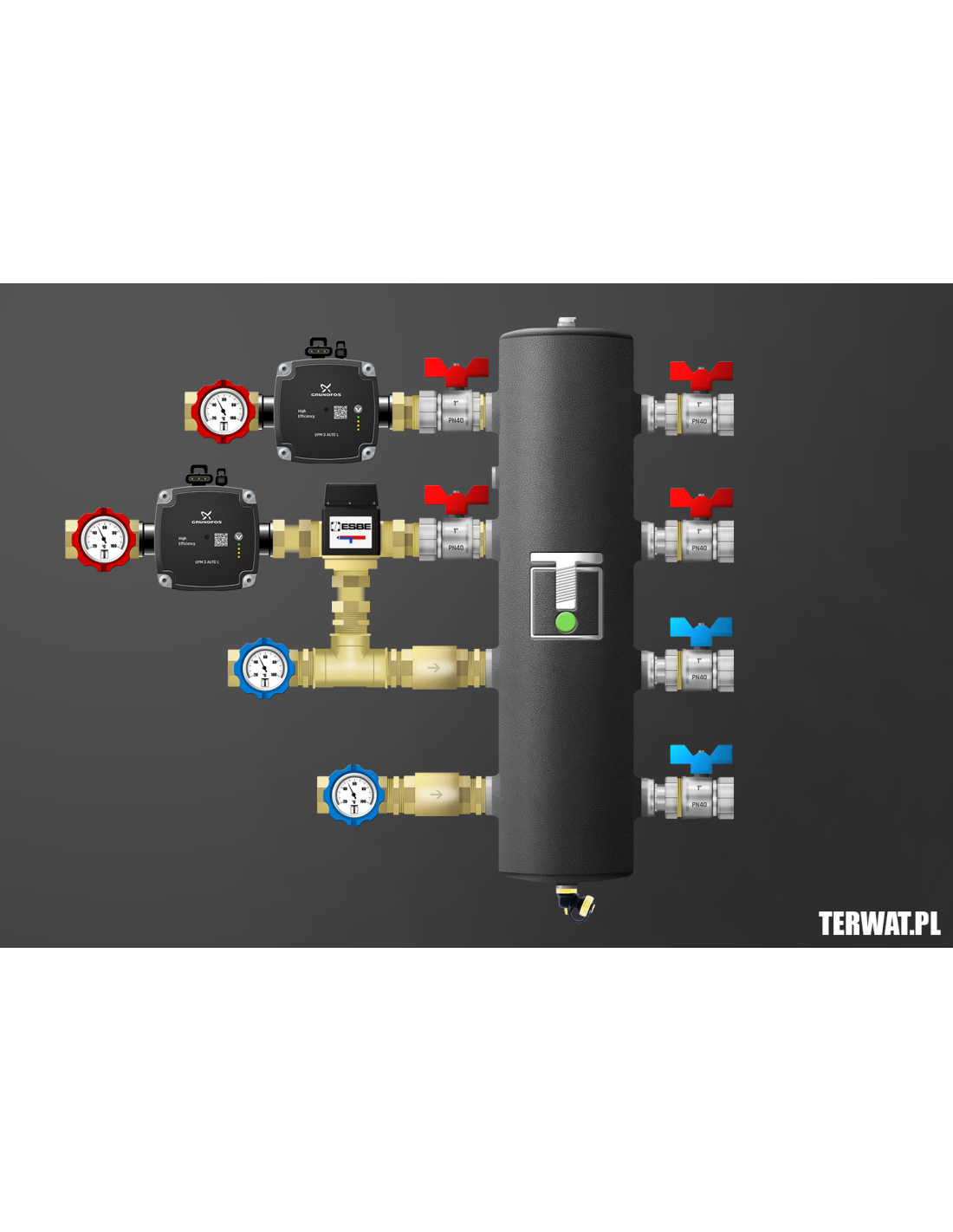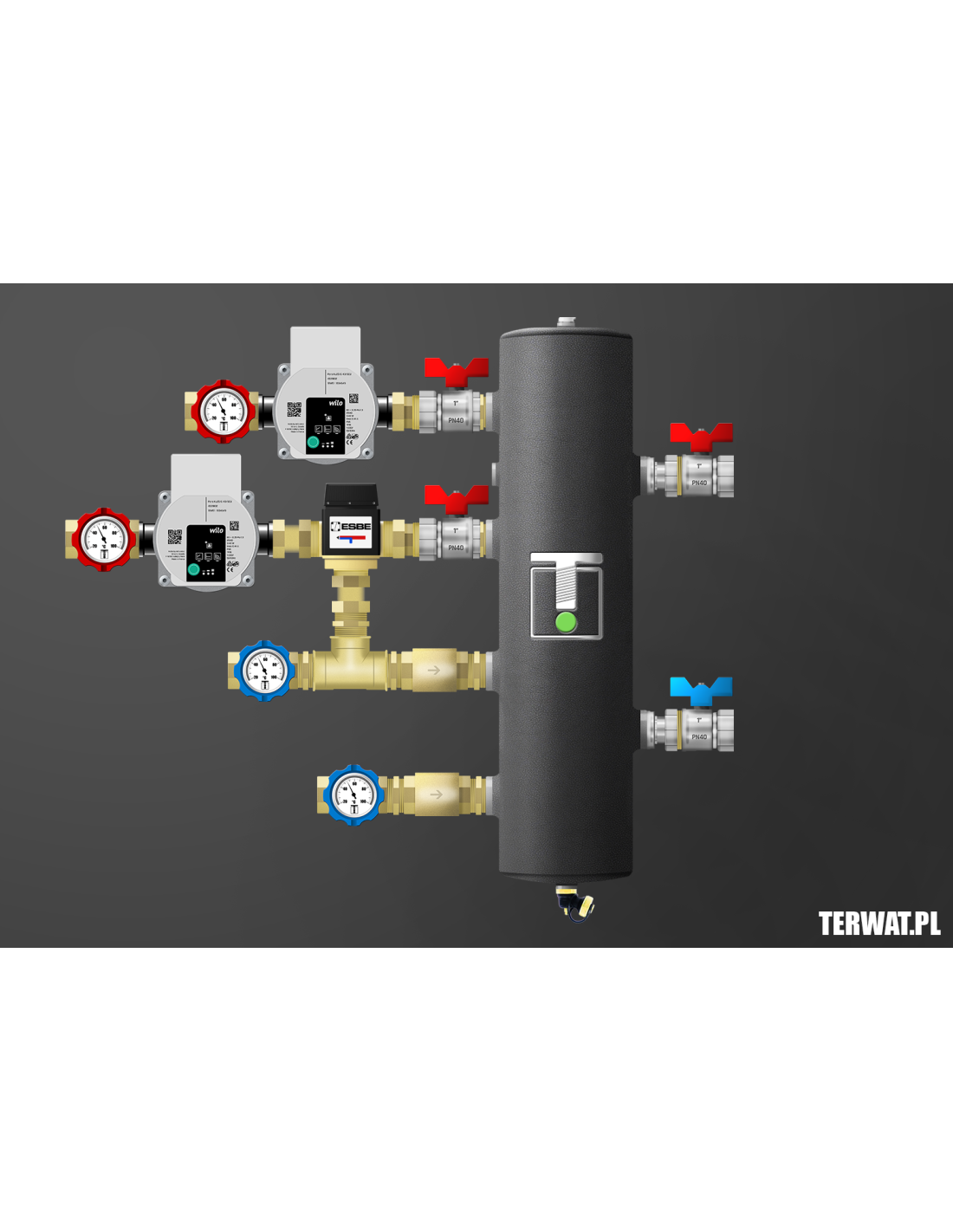 Kompletny zestaw sprzęgła hydraulicznego z dwoma obiegami – jeden bezpośredni, jeden z zaworem mieszającym termostatycznym ESBE 20-55°C Kvs 3.4. Jedno źródło ciepła. W komplecie zawory odcinające 1”, pompy Grundfos UPM 3 AUTO L 15-70 (lub WILO Para), termometry bimetaliczne, odpowietrznik, zawór spustowy, zawory zwrotne na powrocie. Kompletny zestaw do montażu w kotłowni. Montaż w pionie i poziomie. Wersja prawa na zamówienie. Na życzenie zamontujemy kompletną grupę ochrony powrotu kotła stałopalnego z regulowanym zaworem temperaturowym ESBE w zakresie 50-70 st lub grupę ładowania sprzęgła.