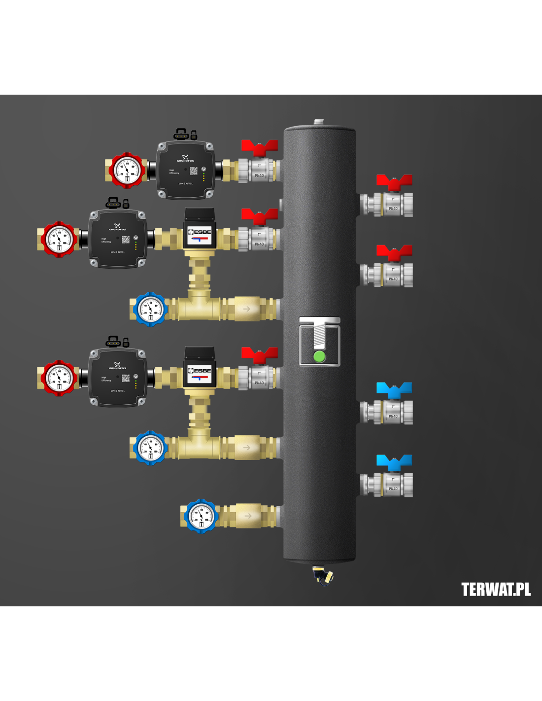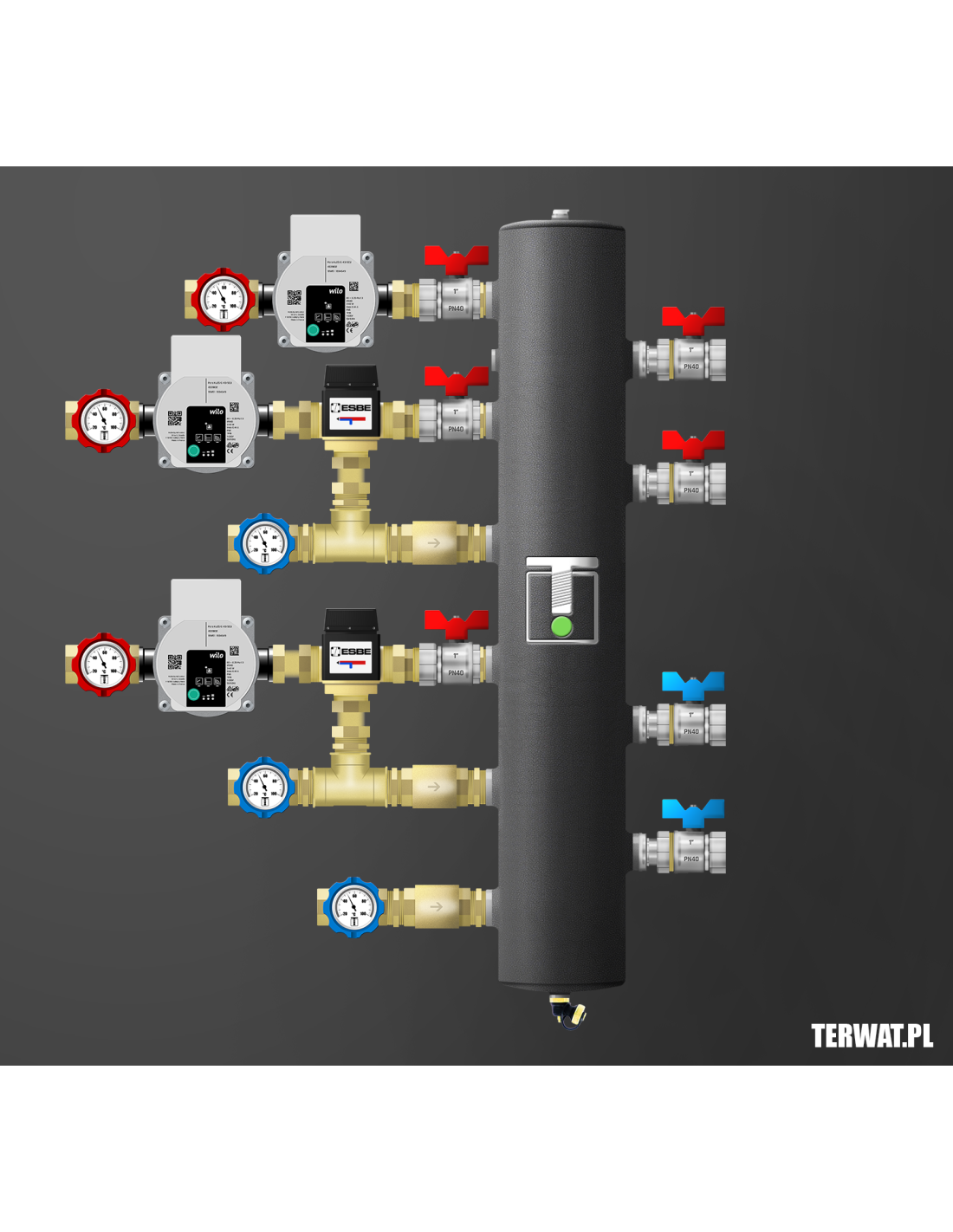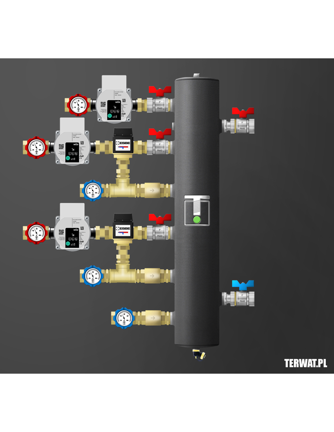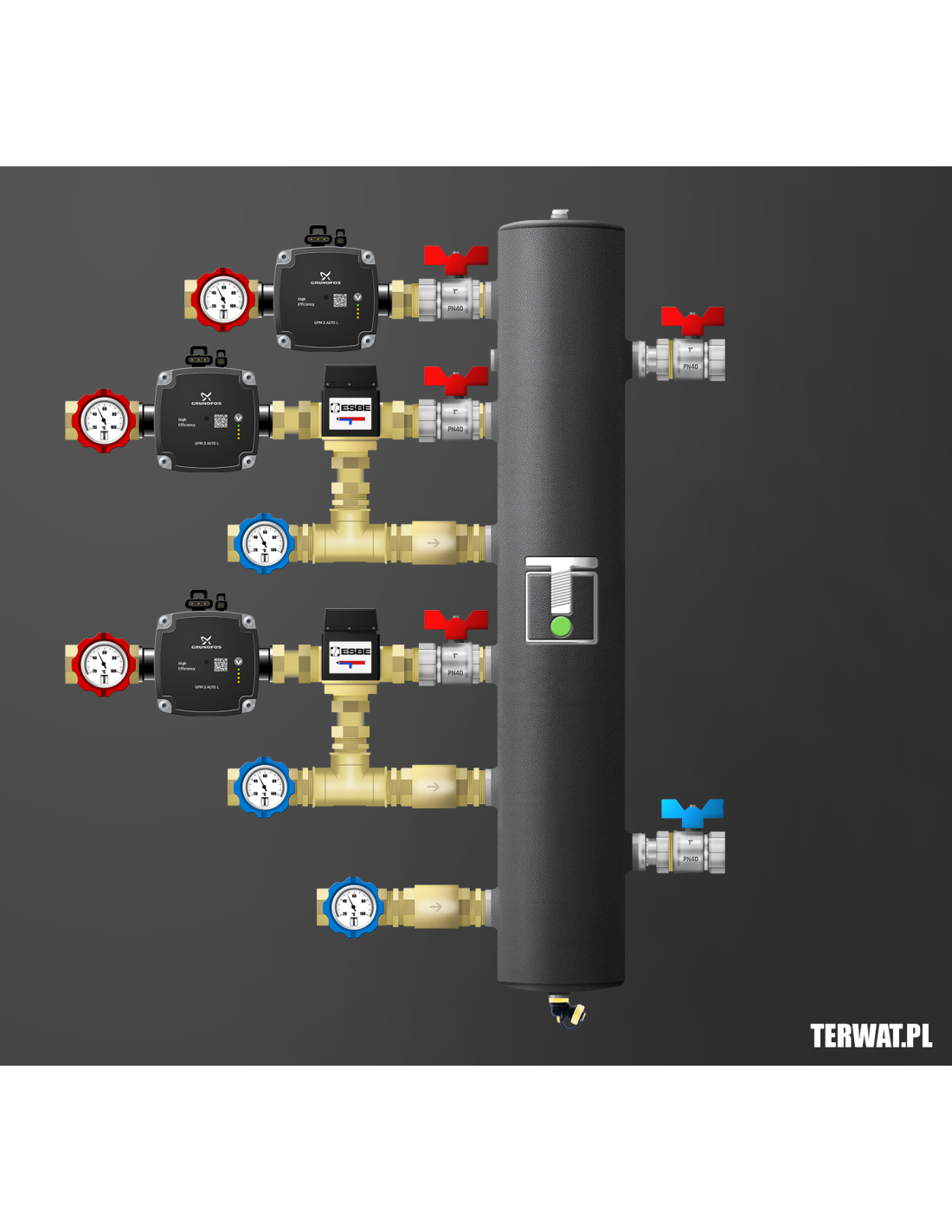 Kompletny zestaw sprzęgła hydraulicznego z trzema obiegami – jeden bezpośredni, dwa z zaworem mieszającym termostatycznym ESBE 20-55°C Kvs 3.4. Ilość źródeł ciepła do wyboru. W komplecie zawory odcinające 1”, pompy Grundfos UPM 3 AUTO L 15-70 (lub WILO Para), termometry bimetaliczne, odpowietrznik, zawór spustowy, zawory zwrotne na powrocie. Kompletny zestaw do montażu w kotłowni. Montaż w pionie i poziomie. Wersja prawa na zamówienie. Na życzenie zamontujemy kompletną grupę ochrony powrotu kotła stałopalnego z regulowanym zaworem temperaturowym ESBE w zakresie 50-70 st lub grupę ładowania sprzęgła.